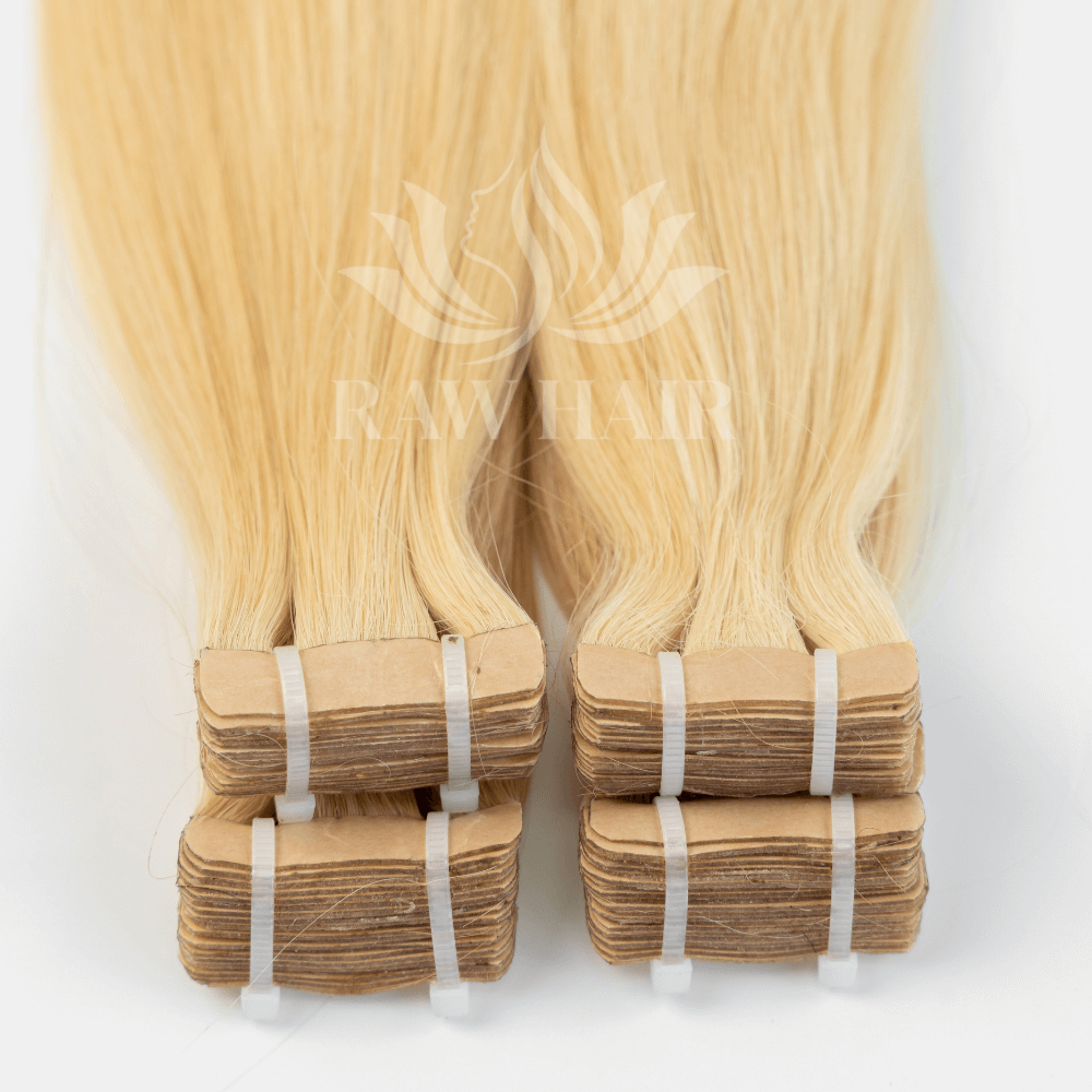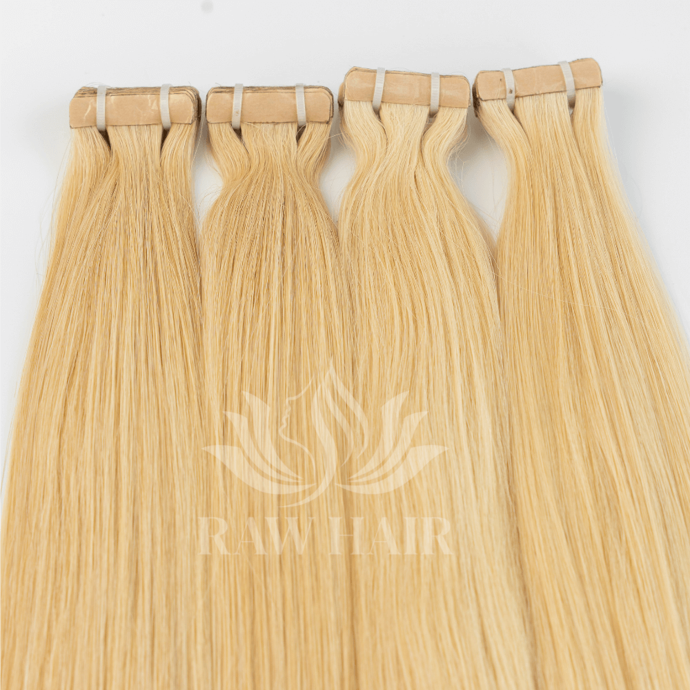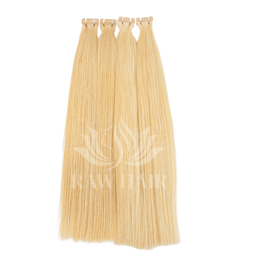 Our Blonde Straight Tape-in Hair Extensions are crafted from 100% high-quality human hair, expertly colored to a radiant blonde while preserving softness and strength. With a sleek, straight texture, this tape-in hair blends naturally into your own for a flawless, undetectable finish.